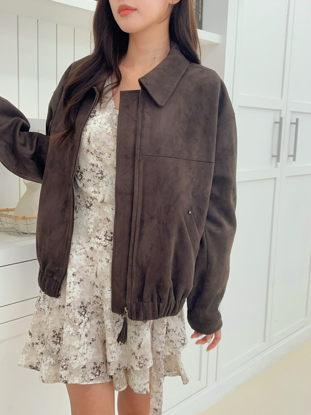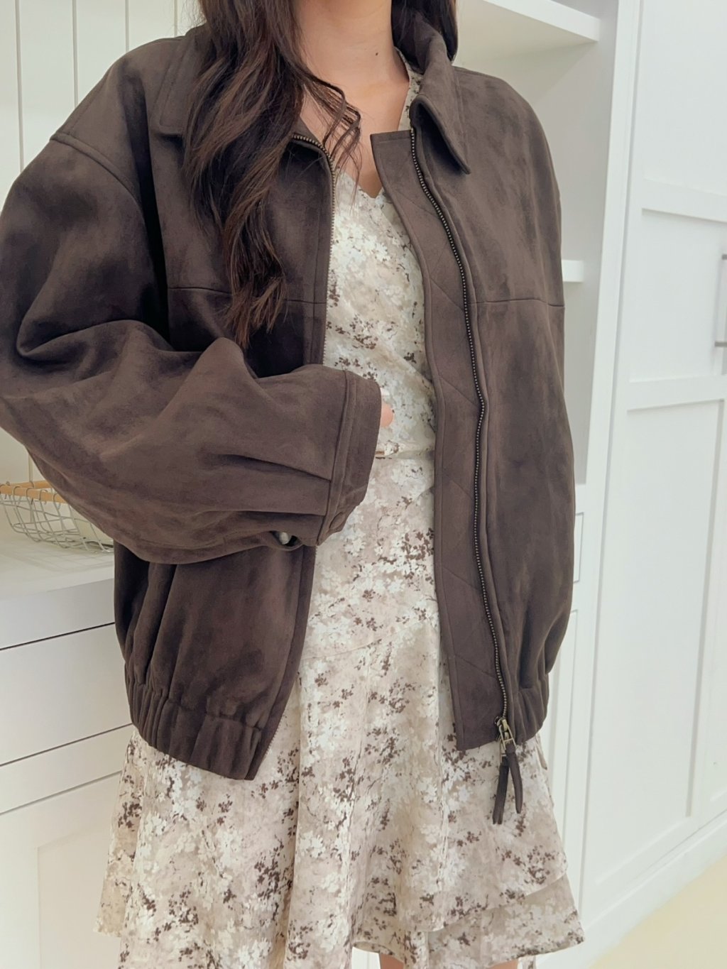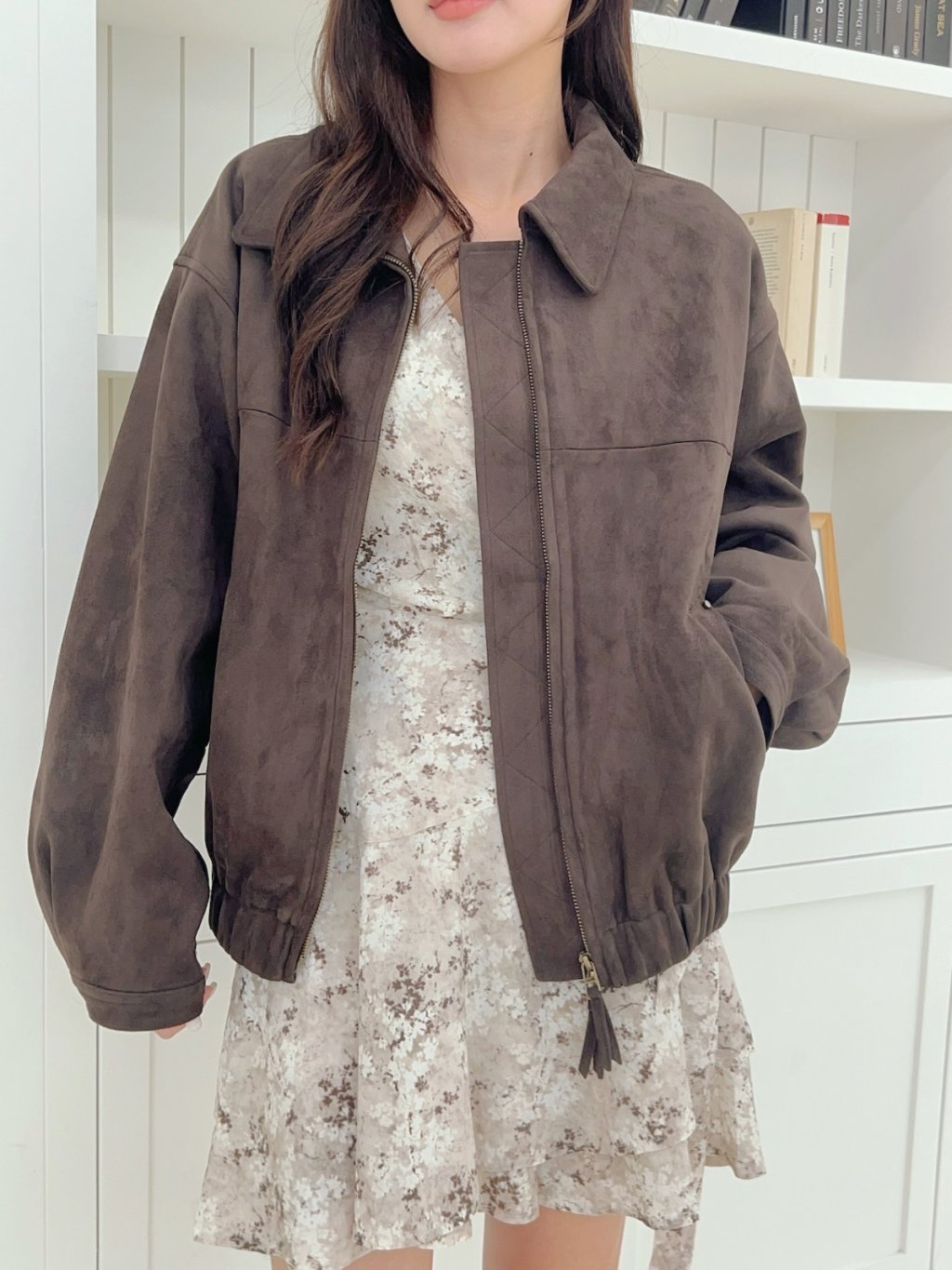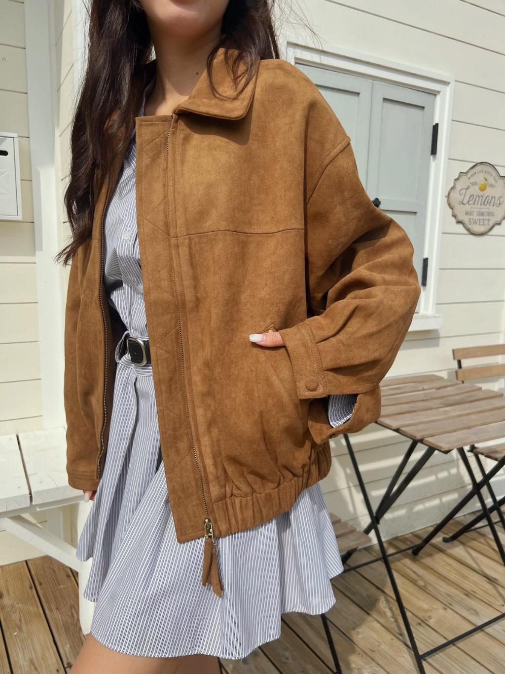 個性翻領拉鍊鬆緊下擺麂皮外套