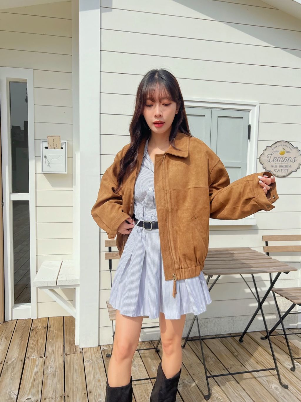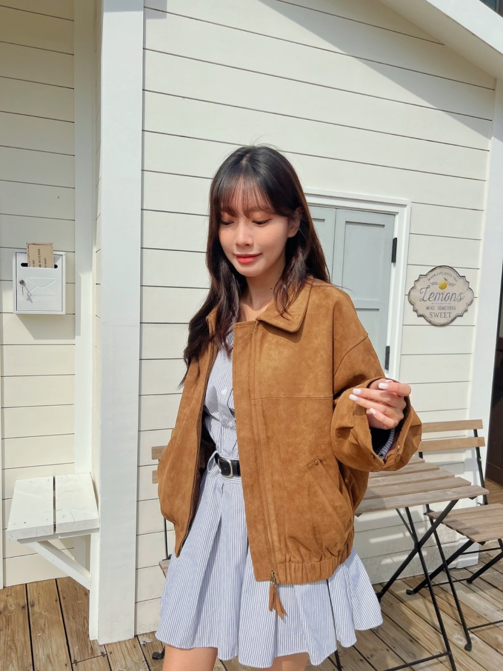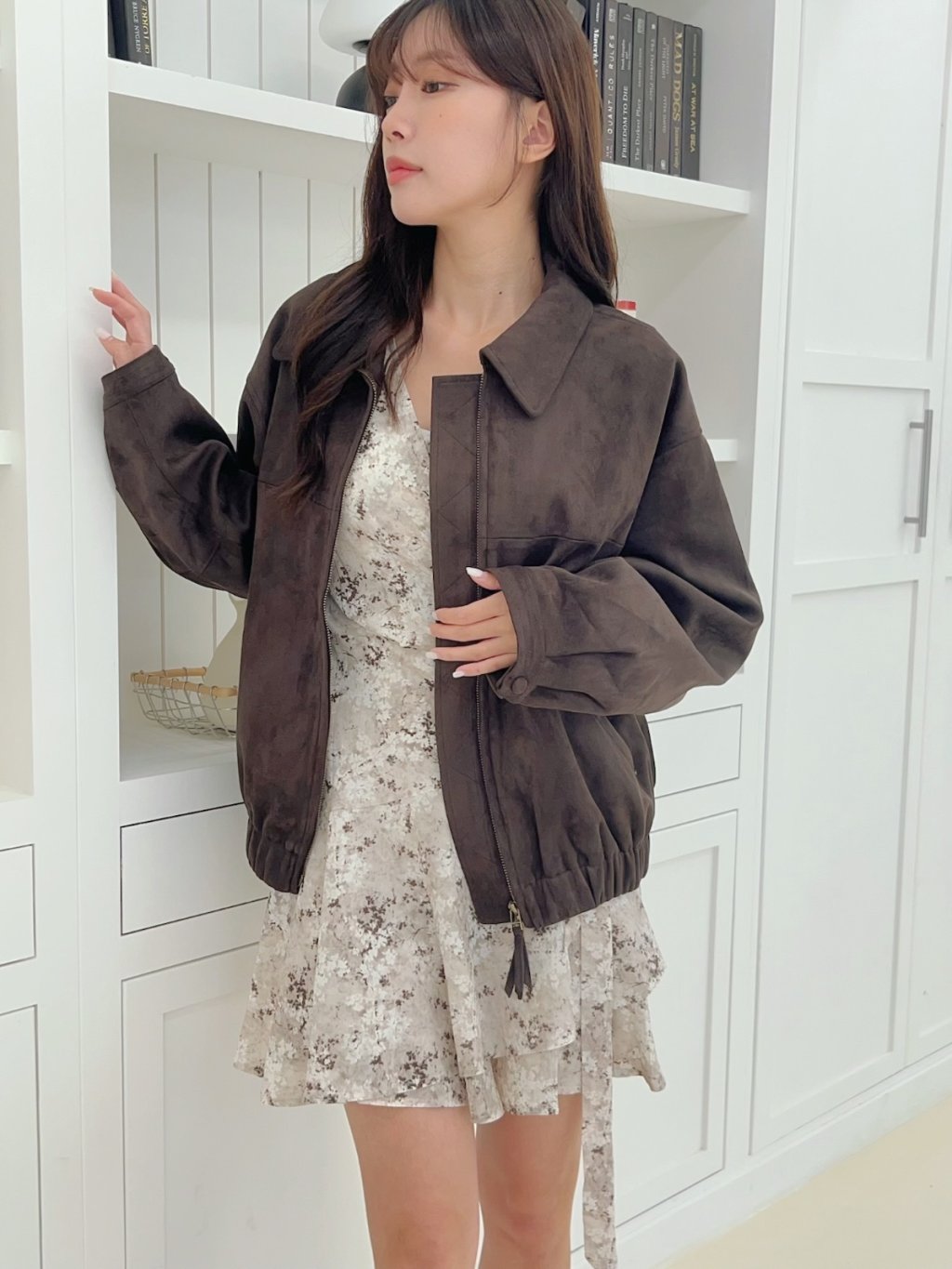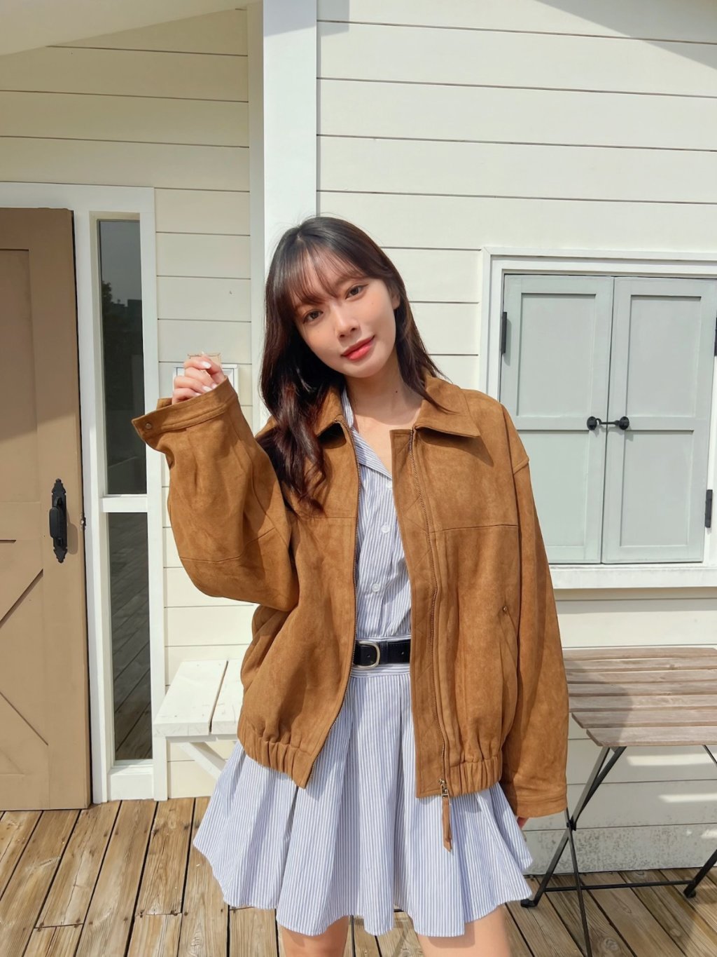 個性翻領拉鍊鬆緊下擺麂皮外套